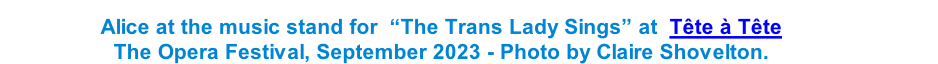 Live Performance Alice finally premieres the long awaited THE TRANS LADY SINGS at Tête à Tête; fulfilling her two year old promise to try to learn to sing!